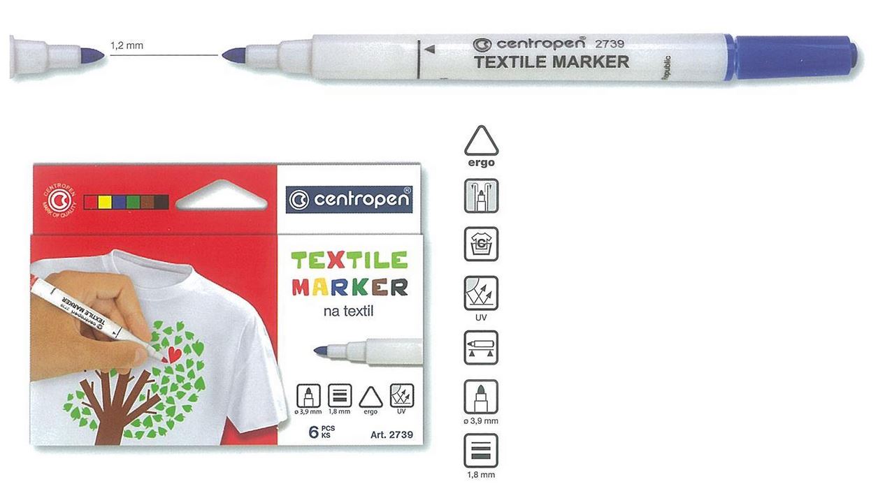 Centropen μαρκαδόροι υφασμάτων. Κατάλληλο για να ζωγραφίζεις επάνω στα ρούχα. Δεν ξεβάφουν με το πλύσιμο. Ασφαλή για παιδιά. Κουτί με 6 χρώματα.