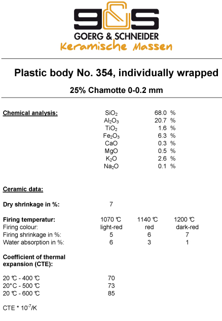 Κόκκινος πηλός, με τρεις διαφορετικές αποχρώσεις βασιζόμενες στην θερμοκρασία, με 25% σαμότ 0,2mm κοκομετρία. Μπισκουΐ 1000°C και γυαλί 1050 έως 1180°C. Συσκευασία 10kg