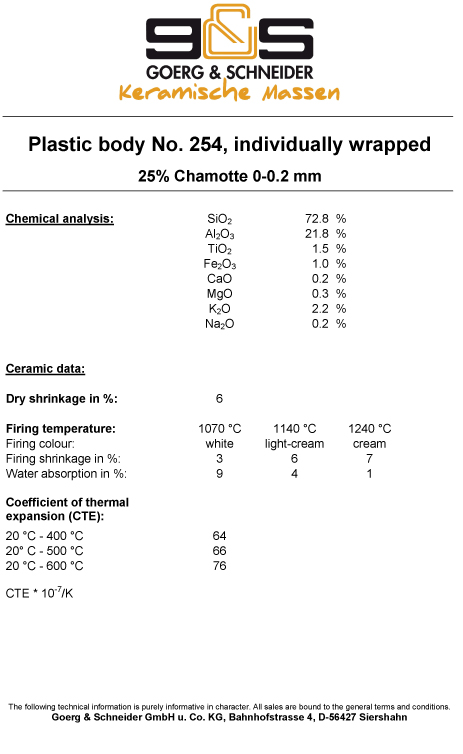 Λευκός μπεζ πηλός, με τρεις διαφορετικές αποχρώσεις βασιζόμενες στην θερμοκρασία, με 25% σαμότ 0-0,2mm κοκομετρία. To μπισκουΐ ψήνεται 1000°C και το γυαλί 1050-1280°C. Συσκευασία 10kg
