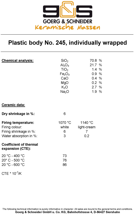 Λευκός μπεζ πηλός, με διαφορετικές αποχρώσεις βασιζόμενες στην θερμοκρασία, χωρίς σαμότ. Το μπισκουΐ ψήνεται 950-960 και το γυαλί 1060-1100°C. Στους 1100°C δημιουργεί μια αίσθηση υαλωποίησης. Συσκευασία 10kg