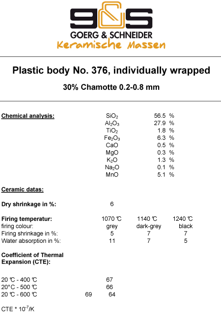 Μαύρος πηλός με 30% σαμότ 0,2-0,8mm κοκομετρία. Το μπισκουΐ ψήνεται στους 1000°C και το γυαλί 1200 - 1240°C. Συσκευασία 10kg