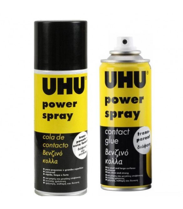 ΠΕΡΙΓΡΑΦΗ ΙΔΙΟΤΗΤΕΣ Γενικής χρήσης. Διαφανές και μόνιμο. Ισχυρό, γρήγορο και καθαρό. Κατάλληλη επίσης για Styrofoam?. Εξαιρετικά ομαλό και ομοιόμορφο μοτίβο ψεκασμού. ΕΦΑΡΜΟΓΗ ΙΔΑΝΙΚΗ ΓΙΑ : Για τη συγκόλληση χαρτιού, χαρτονιού, δέρματος, τσόχας, αφρού, πολλών πλαστικών, πανιών, υφασμάτων, Styrofoam? κλπ. μεταξύ τους και σε πολλά άλλα υλικά όπως ξύλο, κεραμικά, γυαλί κλπ. Δεν είναι κατάλληλο για: Ακατάλληλο για πολυαιθυλένιο (PE), πολυτετραφθοροαιθυλένιο (PTFE) ή σιλικόνη (Si), καθώς αυτά τα πλαστικά έχουν αντι-συγκολλητικές ιδιότητες. ΧΡΗΣΗ ΠΡΙΝ ΤΗΝ ΧΡΗΣΗ Συνθήκες εργασίας Να μη χρησιμοποιείτε σε θερμοκρασίες κάτω τον +10°C. Προσωπική ασφάλεια Η UHU Power Spray περιέχει πτητικούς, εύκολα αναφλέξιμους διαλύτες. Θα πρέπει να λαμβάνονται κατάλληλες προφυλάξεις κατά τη χρήση και αποθήκευση αυτού του προϊόντος. Όταν εφαρμόζετε το προϊόν σε μεγαλύτερες επιφάνειες, διασφαλίστε τον καλό εξαερισμό στην περιοχή εργασίας. Απαιτήσεις επιφάνειας Οι περιοχές προς κόλληση πρέπει να είναι καθαρές, στεγνές και να μην έχουν σκόνη ή λιπαρότητα. κατά τη χρήση Οδηγίες χρήσης Ανακινήστε καλά πριν από τη χρήση. Ψεκάστε από απόσταση περίπου. 15-20 cm για να επιτευχθεί ομοιόμορφη εφαρμογή. Ψεκάστε τα εξαρτήματα που πρόκειται να συνδεθούν ξεχωριστά, αφήστε τα να στεγνώσουν για περίπου 5-20 λεπτά, στη συνέχεια πιέστε μαζί σύντομα και πολύ σταθερά. Αν κολλάτε Styrofoam?, ψεκάστε τις δύο επιφάνειες από απόσταση περίπου 30 cm και αφήστε να στεγνώσει για περίπου 5-20 λεπτά πριν από την ένωση. Σημεία προσοχής Δοχείο υπό πίεση. Προστατεύστε από το ηλιακό φως και μην εκθέτετε το δοχείο σε θερμοκρασίες που υπερβαίνουν τους 50 ° C. Μην τρυπάτε ούτε καίτε το δοχείο , ακόμα και μετά τη χρήση. Πετάξτε μόνο όταν είναι εντελώς άδειο. Μην αναπνέετε ατμούς. Μην ψεκάζετε σε γυμνή φλόγα ή οποιοδήποτε υλικό πυρακτώσεως. Μακριά από πηγές ανάφλεξης - Μην καπνίζετε. Χωρίς επαρκή εξαερισμό μπορεί να γίνει συσσώρευση δυνητικά εκρηκτικών κραμάτων. Να φυλάσσεται μακριά από παιδιά. μετά τη χρήση Λεκέδες / υπολείμματα Χρησιμοποιήστε (καθαρή)βενζίνη για να καθαρίσετε τα λερωμένα μέρη, τον εξοπλισμό και για να αφαιρέστε τους λεκέδες. Συνθήκες αποθήκευσης Το προϊόν πρέπει να αποθηκεύεται σε στεγνό, δροσερό μέρος, όπου δεν υπάρχει πιθανότητα σχηματισμού πάγου.