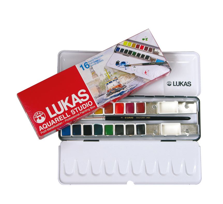 Lukas aquarell STUDIO is a fine moist artists' watercolour. Light fast pigments in a high quality binder combination lead to a top quality water colour with highest colour intensity and transparency. Remains water soluble after drying. Content: 16 half pans LUKAS Aquarell STUDIO , 1 refillable metal box with plastic insert, 1 brush, 1 pencil.