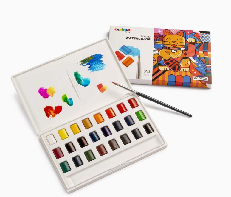 Box with 24 solid watercolors Super pigmented and easily blendable colors Light-resistant The lid can be used as a palette to mix colors Brush included